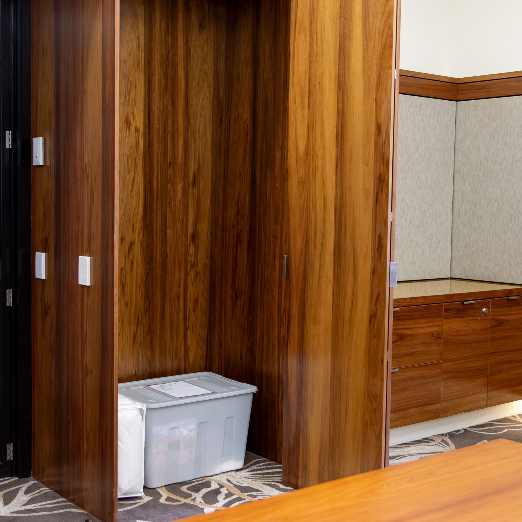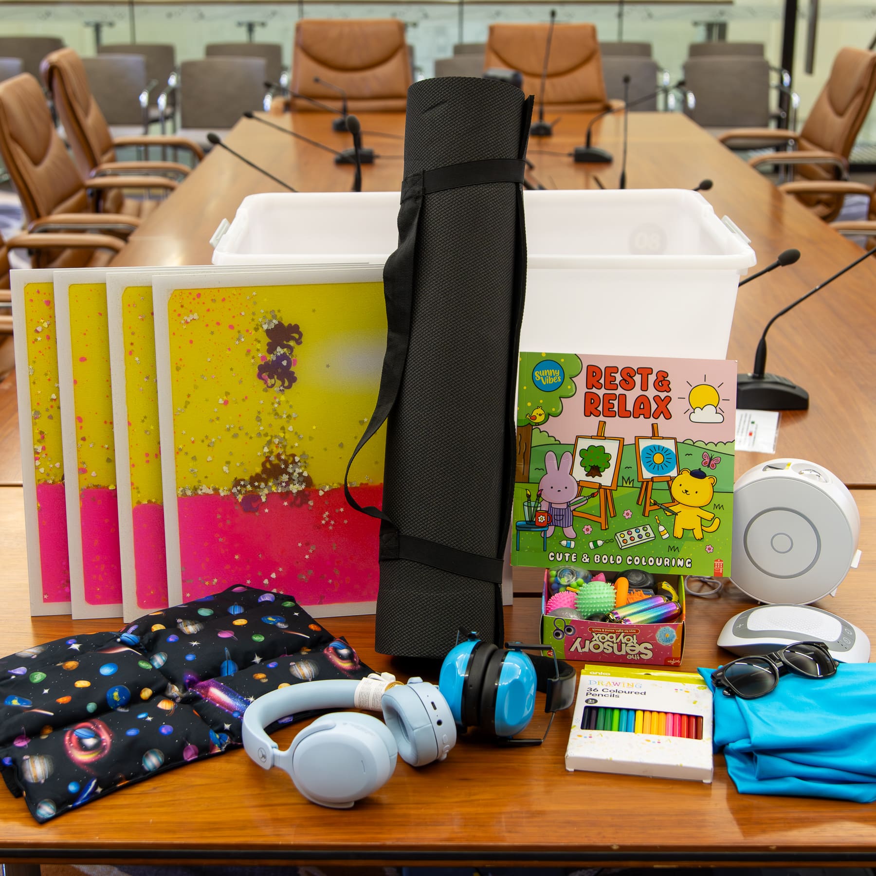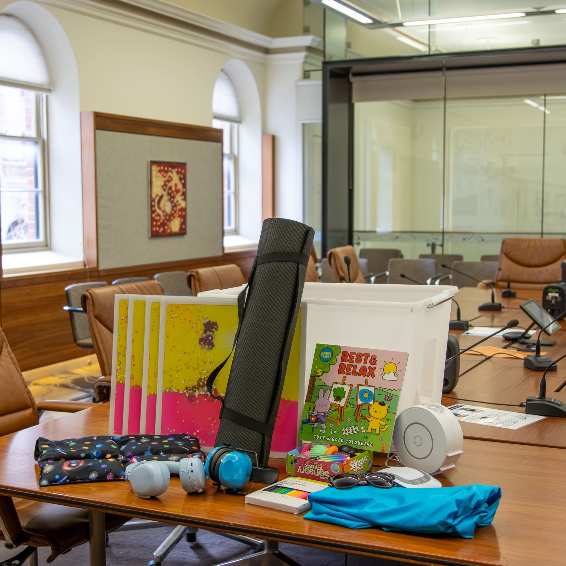 Our main regulation space is a quiet committee room. There is a sensory box available within the regulation space. Images of the box and the room follow: