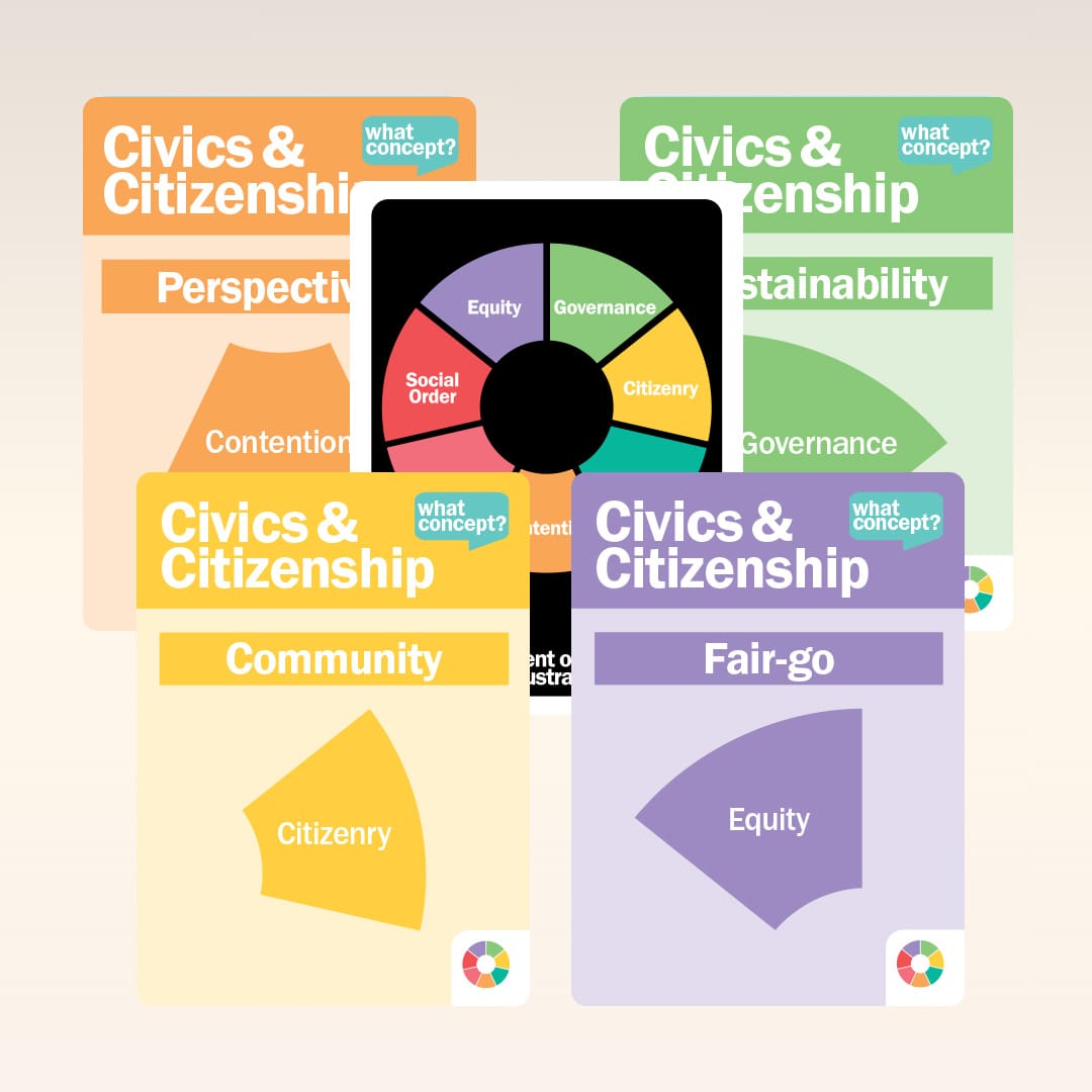Teach and plan through Civics and Citizenship concepts. This deck of cards can be used for multiple activities to teach Civics and Citizenship by exploring the subject’s grammar through a concept wheel. Define the terms, identify concepts in real life, use the concepts as prompts – and more. This resource is also available as a free downloadable pdf. Learn more about the resource here.