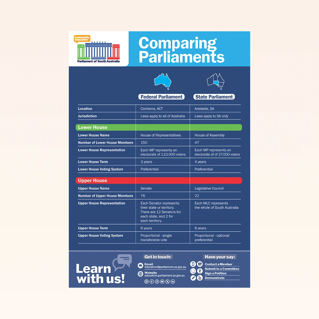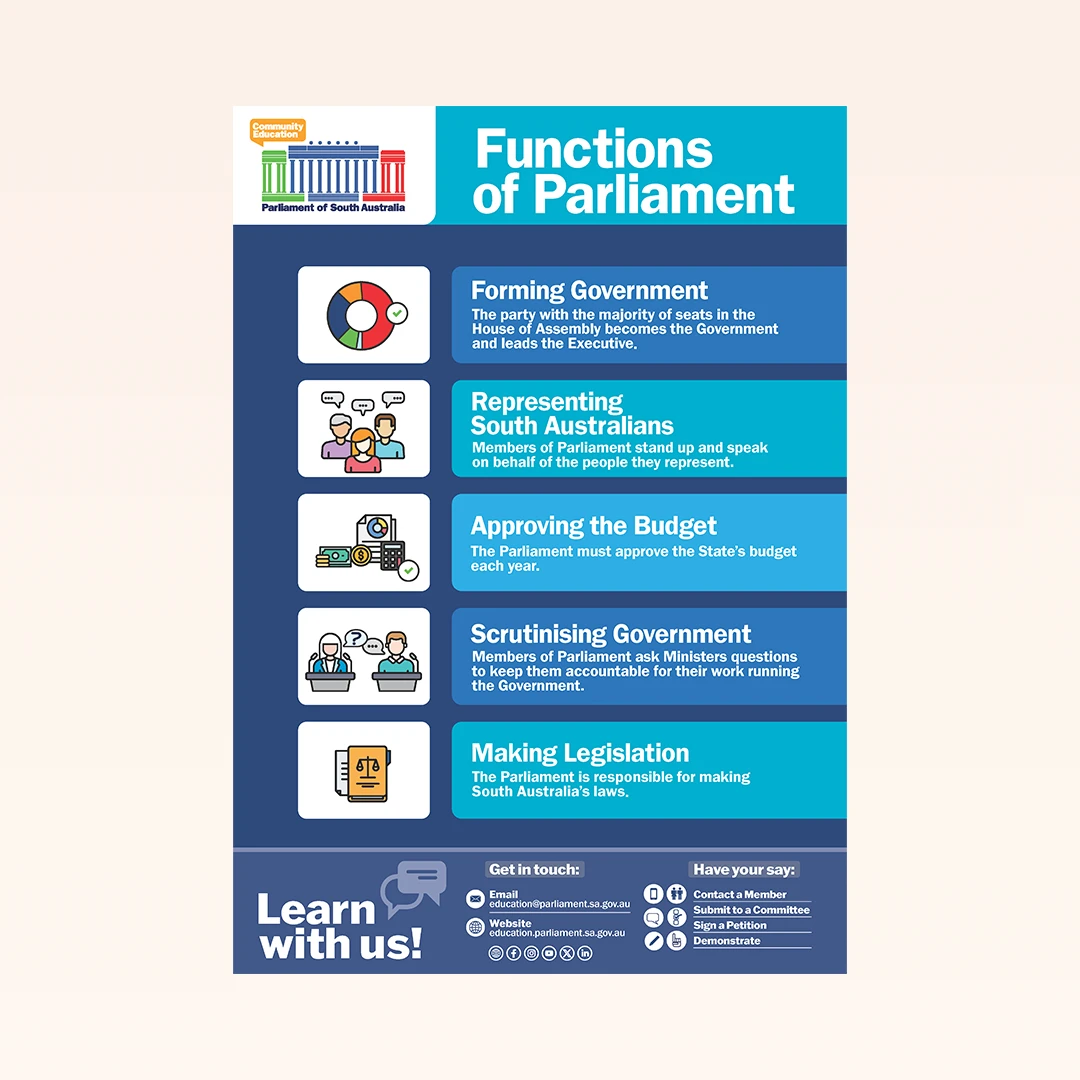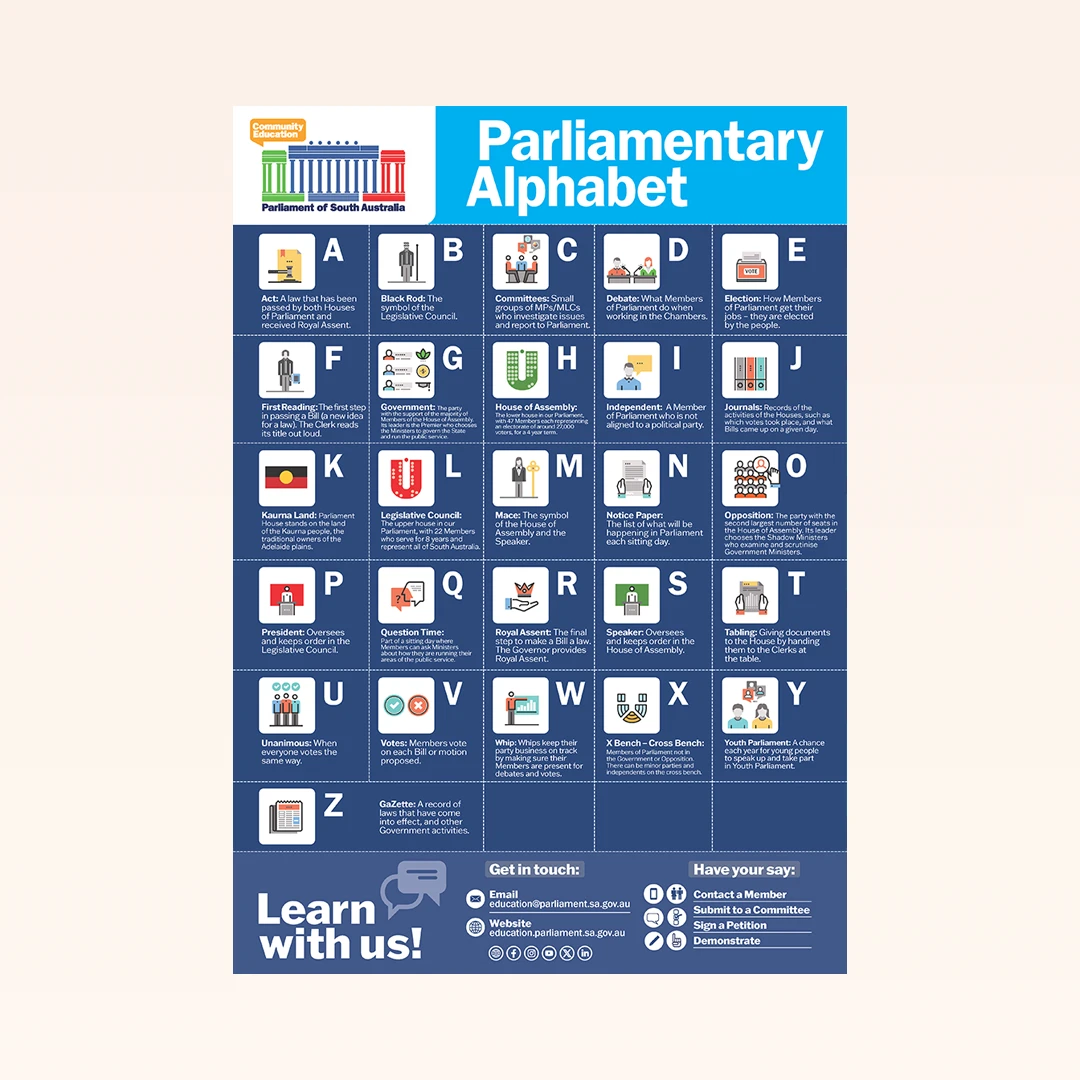 This new poster set contains five A2 posters each displaying specific information about Parliament. If you already have the original set of 5, you can use these as an add on. Set includes: 1x Parliament alphabet poster, 1x Comparing Parliaments poster, 1x Role of a representative poster, 1x Functions of Parliament poster.