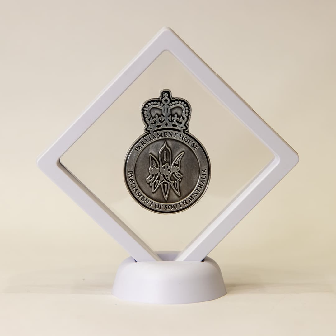 This Parliament of South Australia coin, beautifully crafted in silver, is an ideal keepsake. It comes presented in a stylish white floating frame display stand, making it a striking and memorable souvenir.